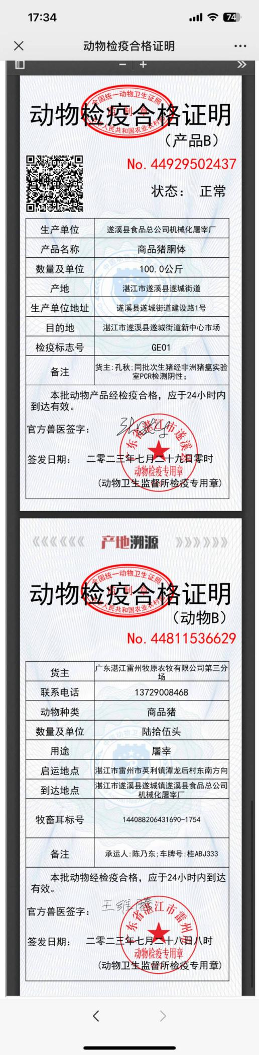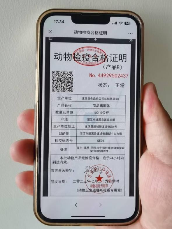 7月29日凌晨12点57分,遂溪县食品总公司机械化屠宰厂的驻场官方兽医开出了湛江市首张动物检疫合格证明(产品B)电子证照,这是继本月初无纸化出具动物B证后,湛江市动物检疫工作在信息化建设上又一次新的突破;标志着湛江市动物检疫合格证明无纸化改革工作、全链条检疫追溯监管体系建设又迈出了历史性的一步,成为全省首个在产地检疫与屠宰检疫环节同时实现无纸化出证的地级市。